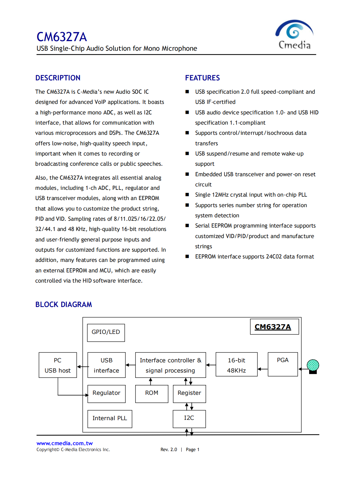 Also, CM6327A integrates all essential analog, 1CH ADC, PLL, regulator, USB transceiver, with external EEPROM to customize your own product string, PID and VID , 8/11/16/22/32/44.1/48KHz sampling rate and high quality 16-bit resolution and friendly general purpose inputs and outputs(GPIO) connect the CM6327A to peripheral hardware, like LED, keypads and buttons, there are many features could be programmable with external EEPROM and MCU. External MCU/EEPROM could be easily controlled via HID software interface. 2 LED indicator pins supported provide more flexible behavior with device on / off / operation / recording mute / and controllable flash time.