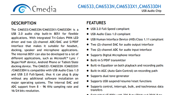 The CM6533 is a USB 2.0 audio chip built-in 8051 for flexible applications. With integrated Tri-Colors PWM LED driver and two-channel ADC/DAC and S/PDIF interface that makes it suitable for headset, docking, speaker and microphone applications. The internal 8051 can also be developed to a lot of different applications, such as Microsoft™ Lync/Skype/VoIP device, Android Phone or Tablet/Slate docking device. The CM6533 is compatible with USB Audio Class 1.0 and USB 2.0 Full-Speed, thus it can plug & play without any additional software installation on major operating systems. The internal DAC and ADC support from 8 ~ 96 KHz sampling rate and 16/24 bits resolution.