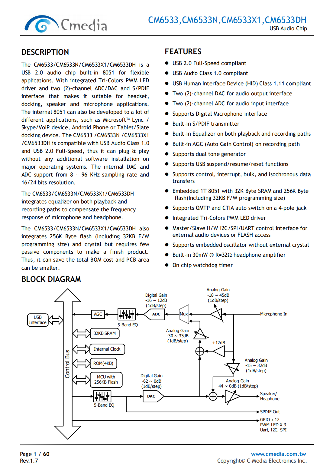 The CM6533X1 is a USB 2.0 audio chip built-in 8051 for flexible applications. With integrated Tri-Colors PWM LED driver and two-channel ADC/DAC and S/PDIF interface that makes it suitable for headset, docking, speaker and microphone applications. The internal 8051 can also be developed to a lot of different applications, such as Microsoft™ Lync/Skype/VoIP device, Android Phone or Tablet/Slate docking device. The CM6533X1 is compatible with USB Audio Class 1.0 and USB 2.0 Full-Speed, thus it can plug & play without any additional software installation on major operating systems. The internal DAC and ADC support from 8 ~ 96 KHz sampling rate and 16/24 bits resolution.