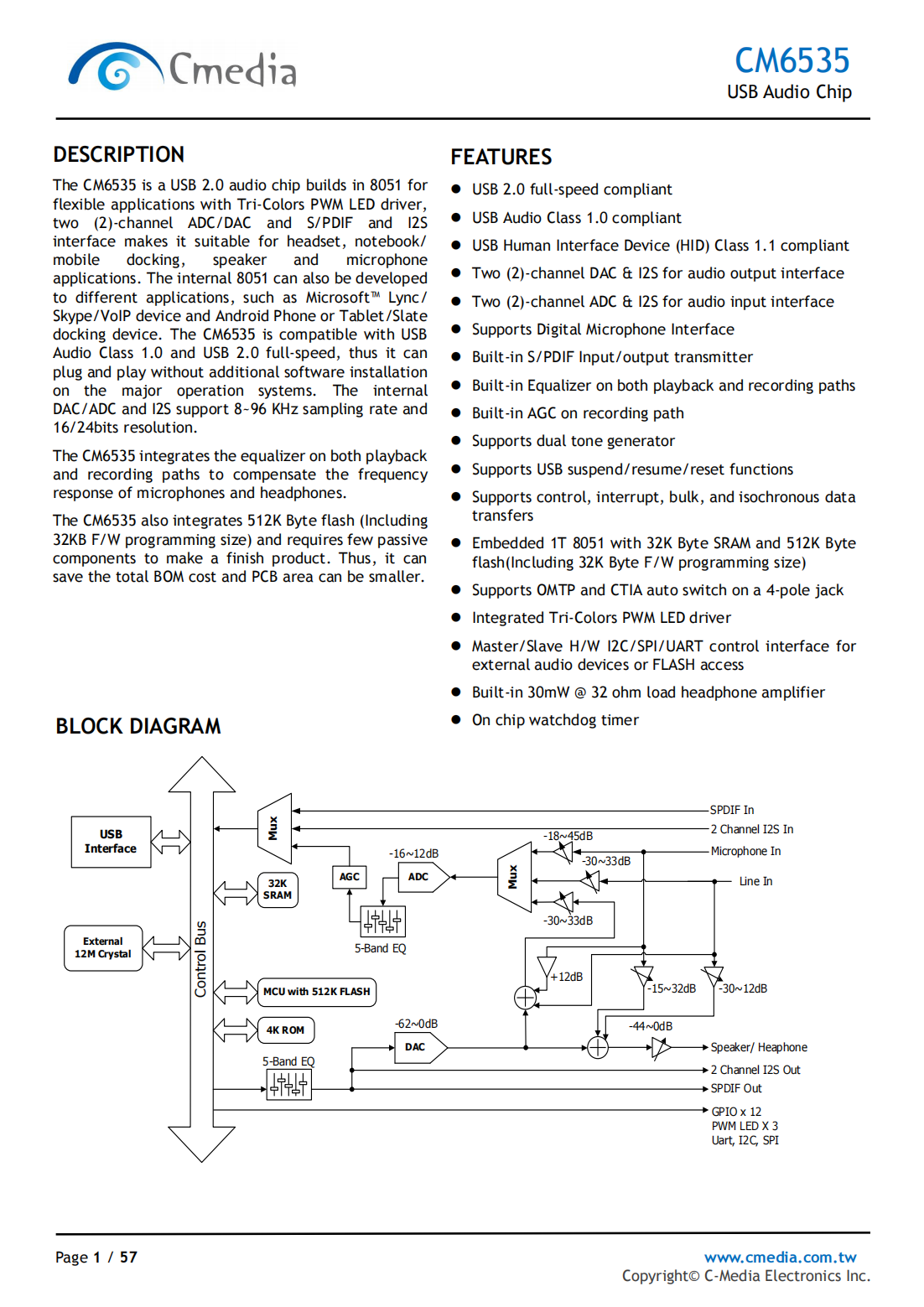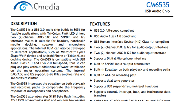 The CM6535 is a USB 2.0 audio chip built-in 8051 for flexible applications. With integrated Tri-Colors PWM LED driver and two-channel ADC/DAC and S/PDIF interface that makes it suitable for headset, docking, speaker and microphone applications. The internal 8051 can also be developed to a lot of different applications, such as Microsoft™ Lync/Skype/VoIP device, Android Phone or Tablet/Slate docking device. The CM6535 is compatible with USB Audio Class 1.0 and USB 2.0 Full-Speed, thus it can plug & play without any additional software installation on major operating systems. The internal DAC and ADC support from 8 ~ 96 KHz sampling rate and 16/24 bits resolution.