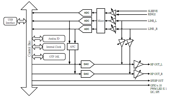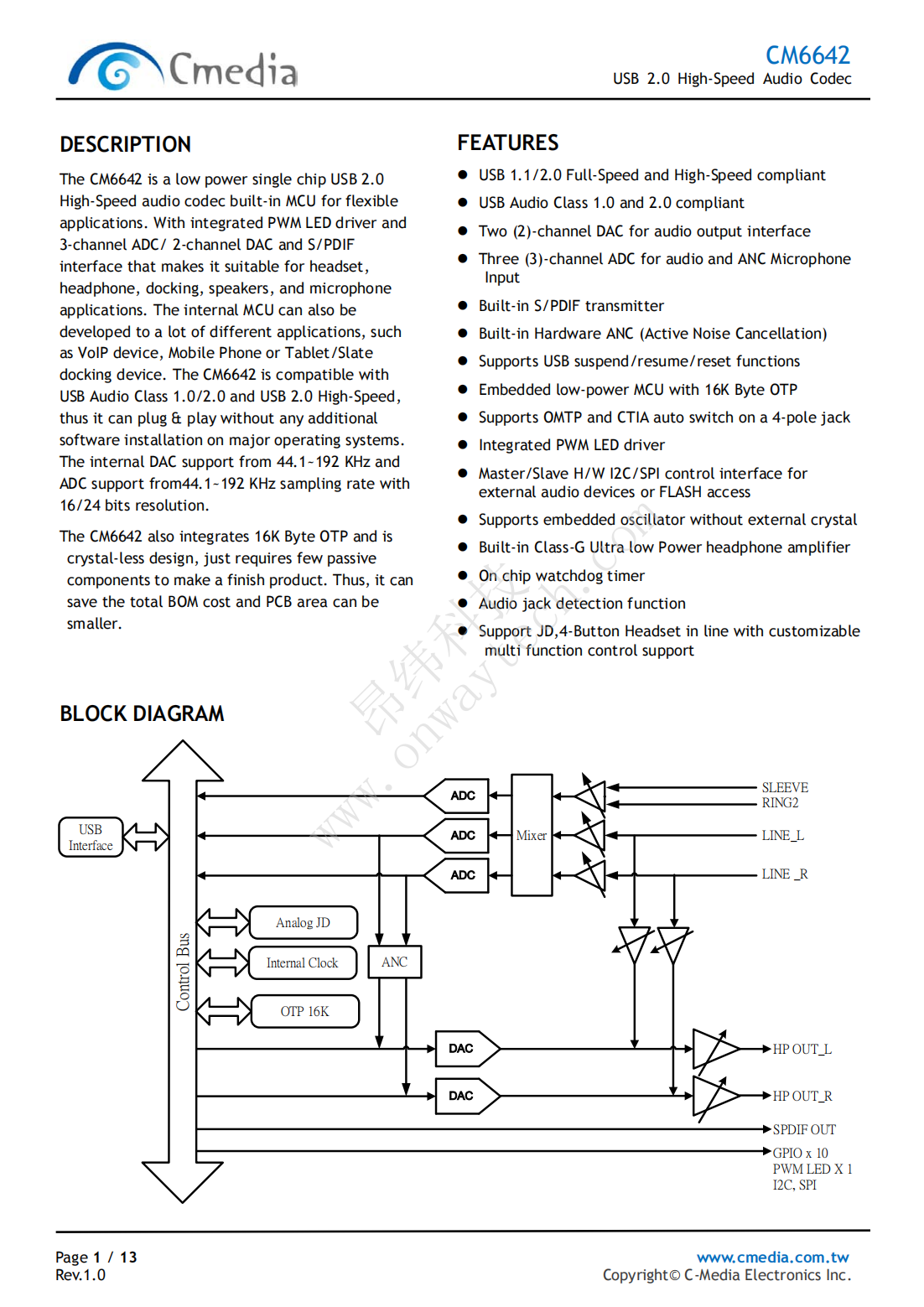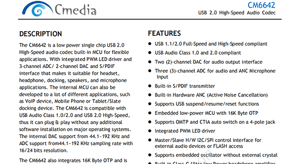 The CM6642 is a low power single chip USB 2.0 High-Speed audio codec built-in MCU for flexible applications. With integrated PWM LED driver and 3-channel ADC/ 2-channel DAC and S/PDIF interface that makes it suitable for headset, headphone, docking, speakers, and microphone applications. The internal MCU can also be developed to a lot of different applications, such as VoIP device, Mobile Phone or Tablet/Slate docking device. The CM6642 is compatible with USB Audio Class 1.0/2.0 and USB 2.0 High-Speed, thus it can plug & play without any additional software installation on major operating systems. The internal DAC support from 44.1~192 KHz and ADC support from44.1~192 KHz sampling rate with 16/24 bits resolution.