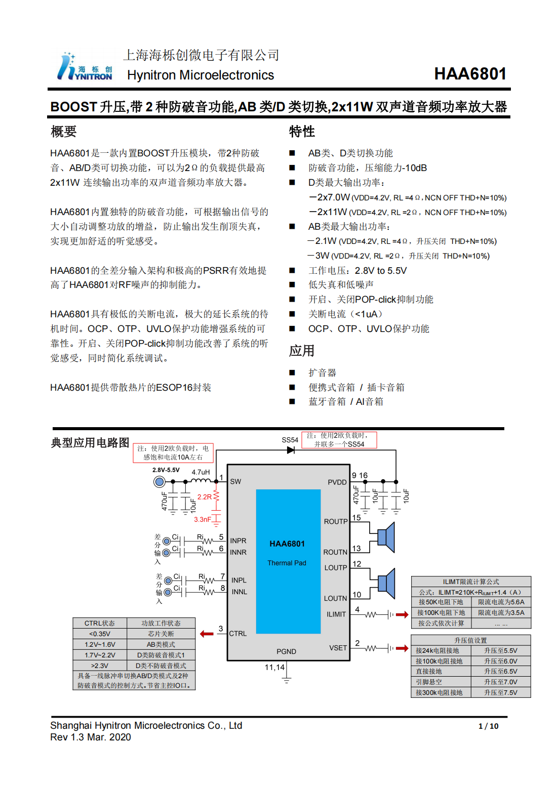 HAA6801是一款内置BOOST升压模块,带2种防破音、AB/D类可切换功能,可以为2Ω的负载提供最高2x10W 连续输出功率的双声道音频功率放大器。