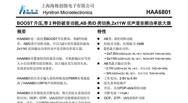 HAA6801具有极低的关断电流,极大的延长系统的待机时间。OCP、OTP、UVLO保护功能增强系统的可靠性。开启、关闭POP-click抑制功能改善了系统的听觉感受,同时简化系统调试。HAA6801提供带散热片的ESOP16封装。