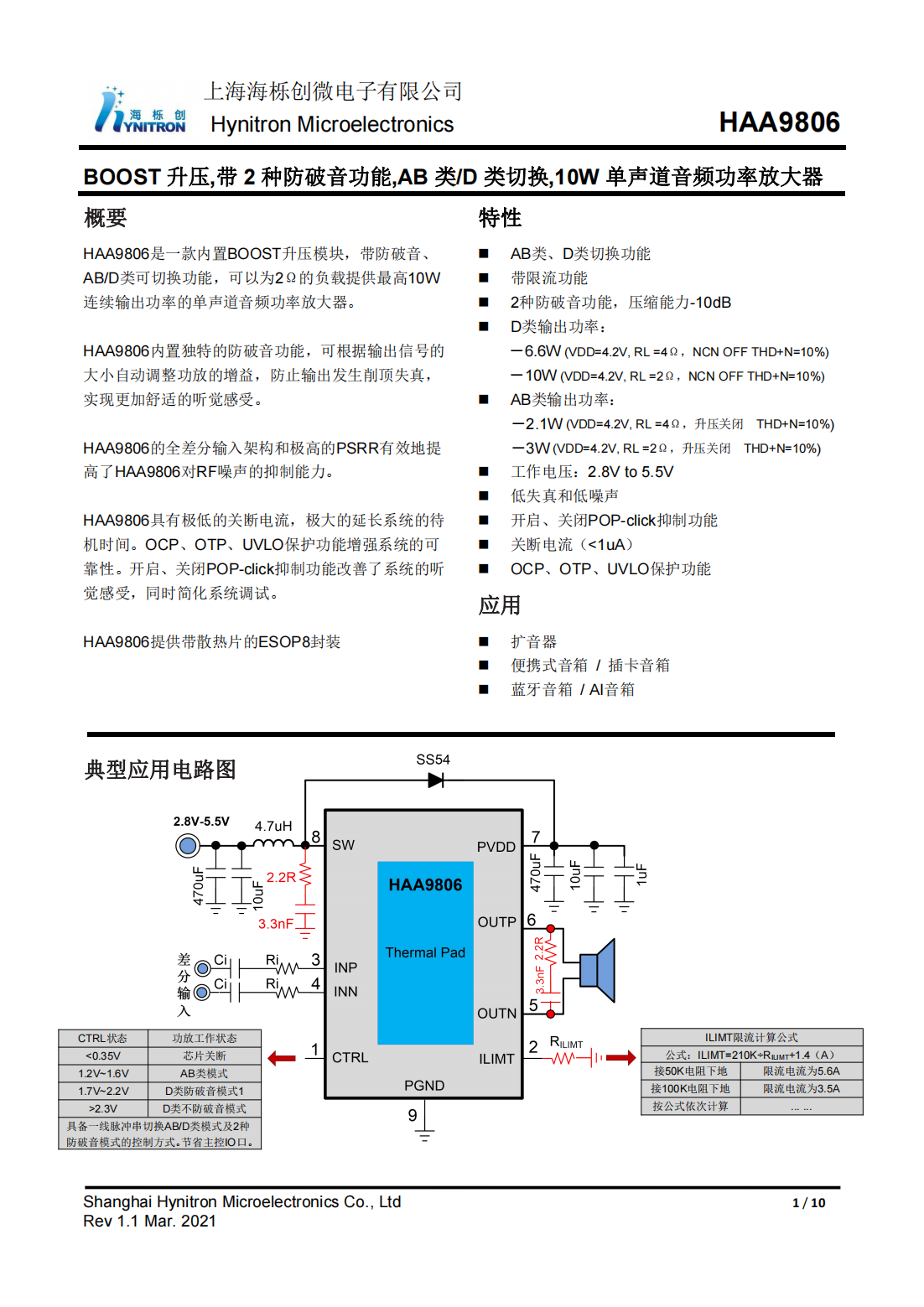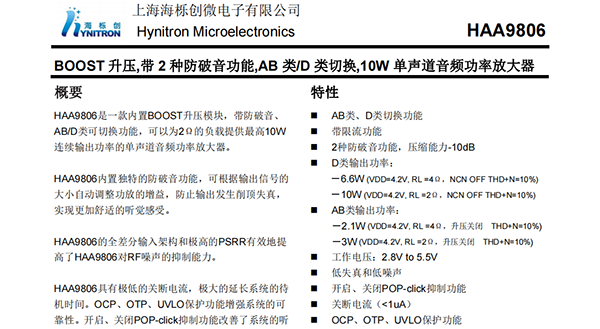 HAA9806具有极低的关断电流,极大的延长系统的待机时间。OCP、OTP、UVLO保护功能增强系统的可靠性。开启、关闭POP-click抑制功能改善了系统的听觉感受,同时简化系统调试。