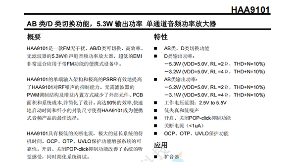 HAA9101是AB类/D类切换功能,5.3W输出功率单通道音频功率放大器,HAA9101提供带散热片的ESOP8封装