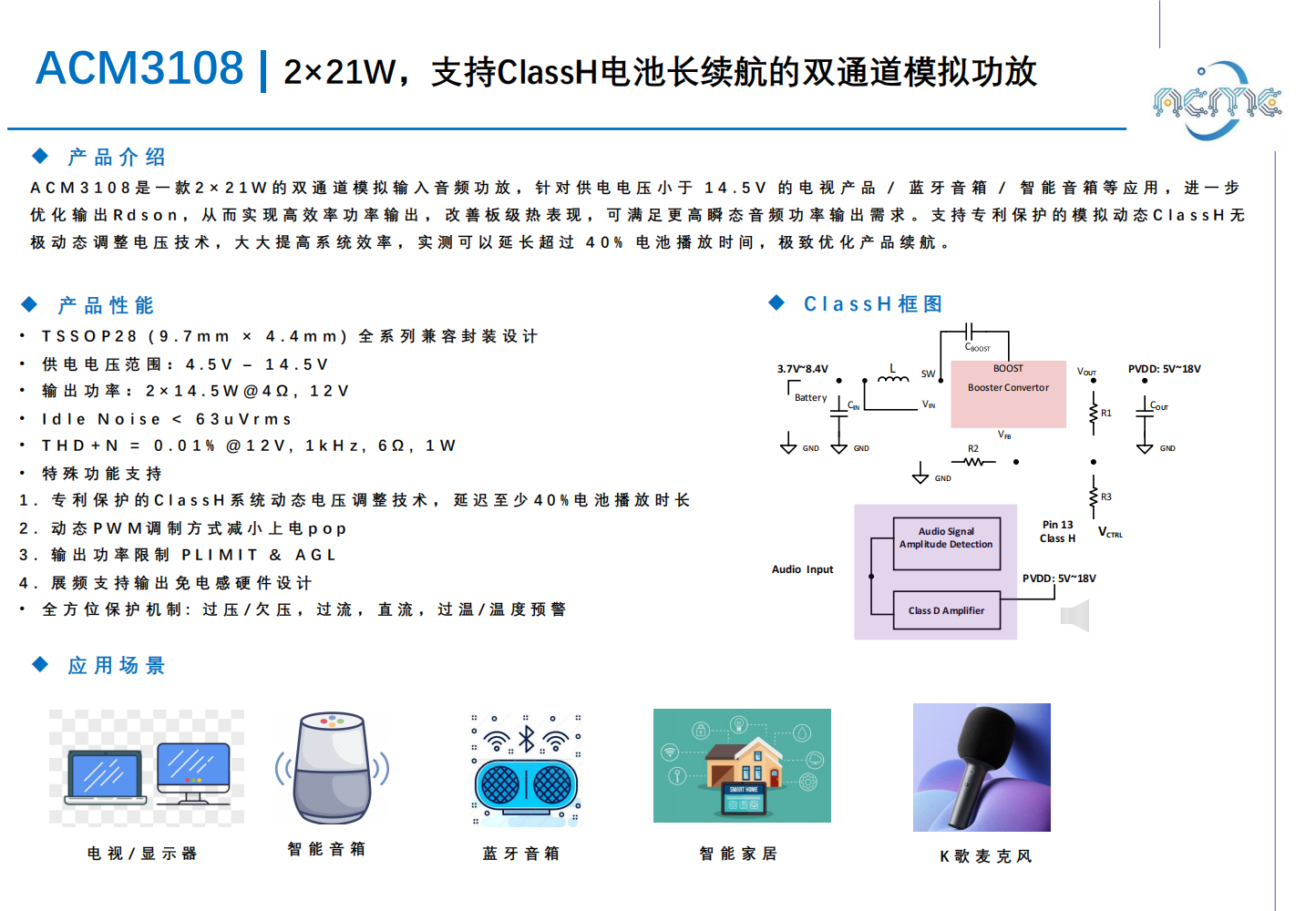 ACM3108在4Ω负载下可以输出立体声2X25W,或者单通道2Ω负载下输出 1X50W。是一款高效率的D类音频功放。采用新型专利技术动态PWM,降低全输出段的功耗。