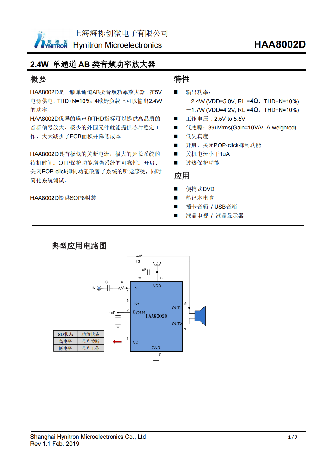 HAA8002D_2.4W 单通道AB类音频功率放大器