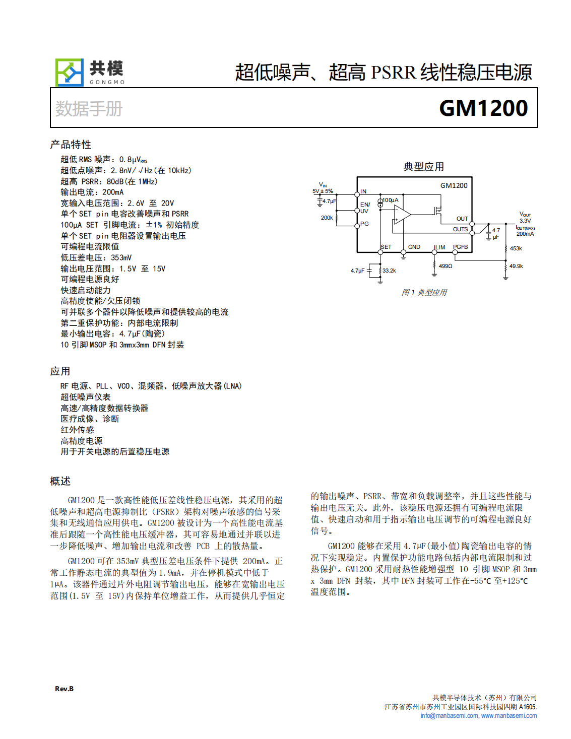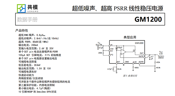GM1200 是一款高性能低压差线性稳压电源,其采用的超 低噪声和超高电源抑制比(PSRR)架构对噪声敏感的信号采集和无线通信应用供电。