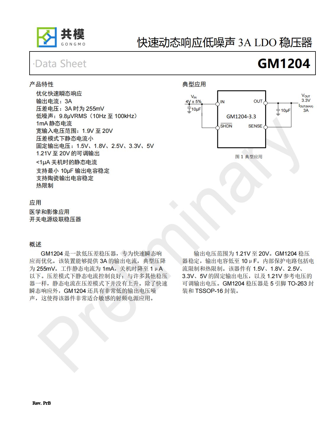 GM1204 是一款低压差稳压器,专为快速瞬态响 应而优化。该装置能够提供 3A 的输出电流,典型压降 为 255mV。