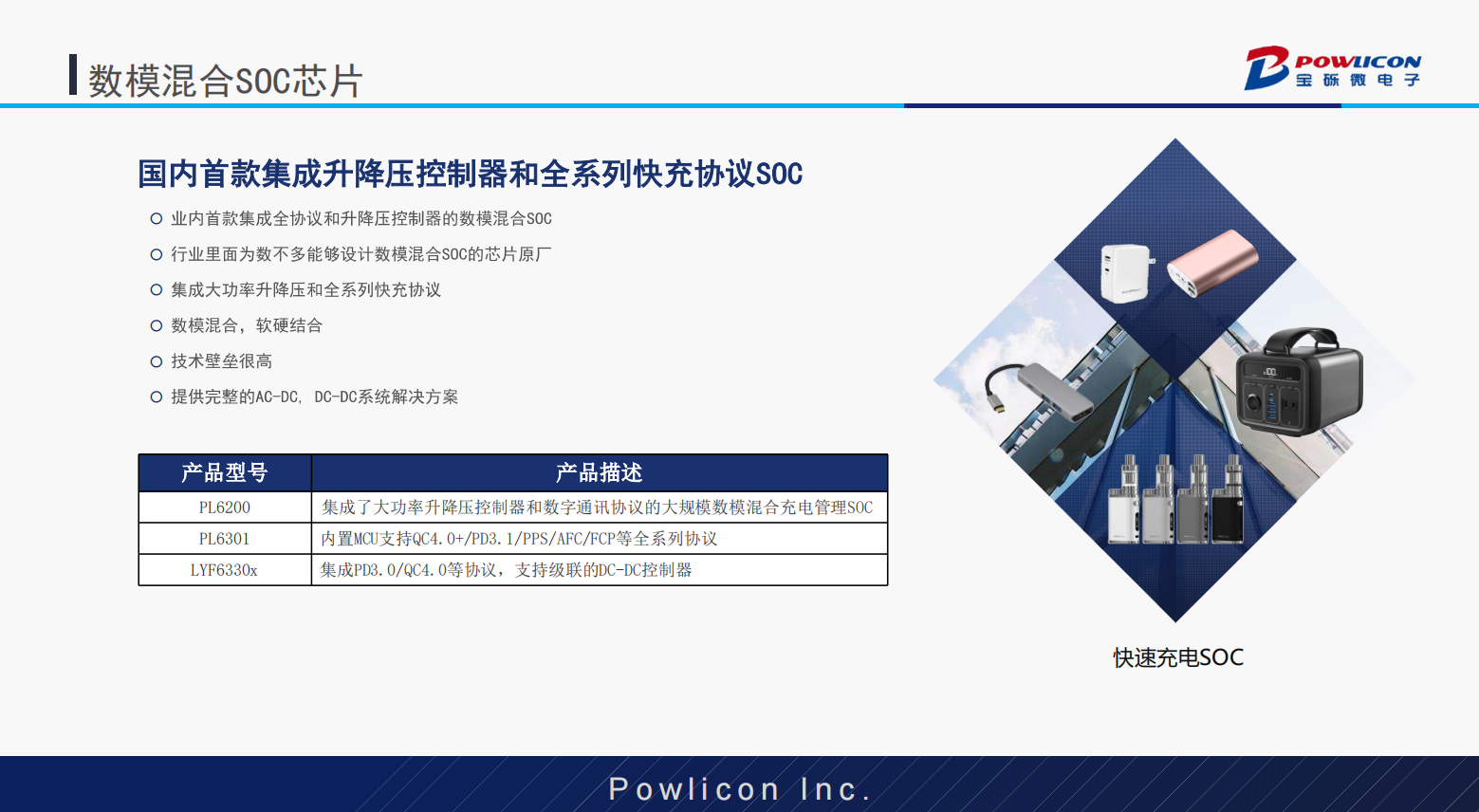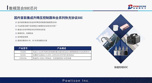 PL6200可同时支持1C+2A+MicroB+Lighting 5个USB接口,兼容PD2.0/3.0、QC2.0/3.0、AFC、FCP、SCP等市面全主流快充协议,支持1-6串电池充电管理,实现涓流充电、恒流充电、恒压充电、充电截止;可编程配置3-4.5V电池类型,兼容锂电池以及磷酸铁锂电池充放电。