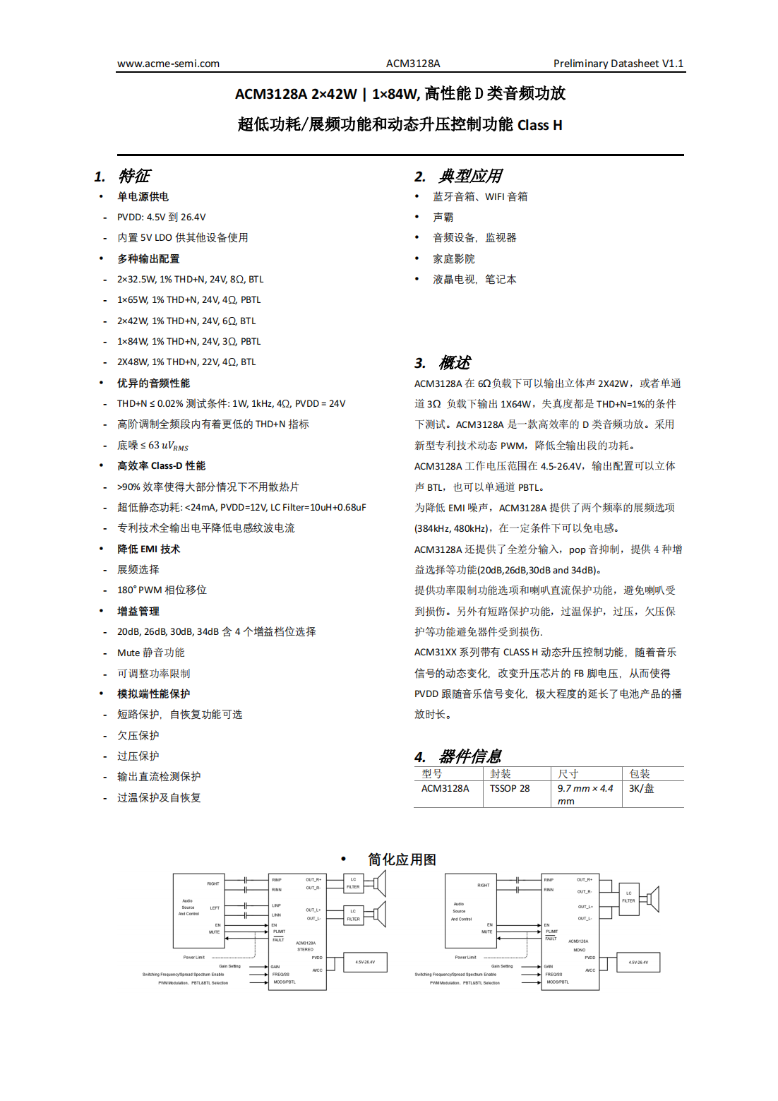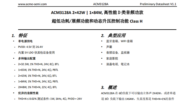 ACM3128A在6Ω负载下可以输出立体声2X42W,或者单通道3Ω负载下输出1X64W,失真度都是THD+N=1%的条件下测试。ACM3128A是一款高效率的D类音频功放。采用新型专利技术动态PWM,降低全输出段的功耗。