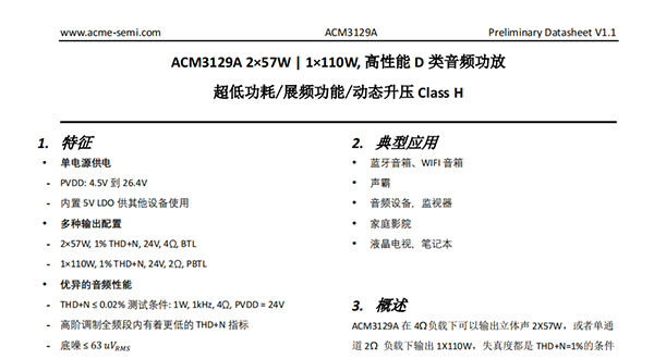 ACM3129A在4Ω负载下可以输出立体声2X57W,或者单通道2Ω负载下输出1X110W,失真度都是THD+N=1%的条件下测试。ACM3129A是一款高效率的D类音频功放。采用新型专利技术动态PWM,降低全输出段的功耗。