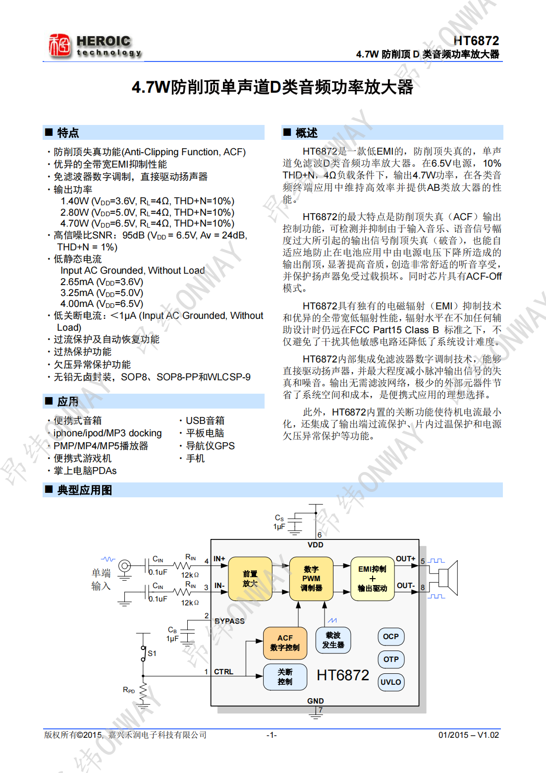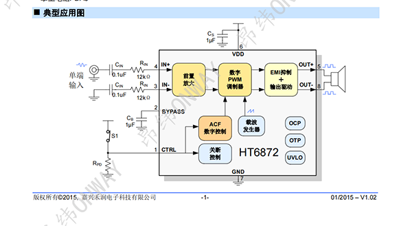 HT6872_4.7W防削顶单声道D类音频功率放大器