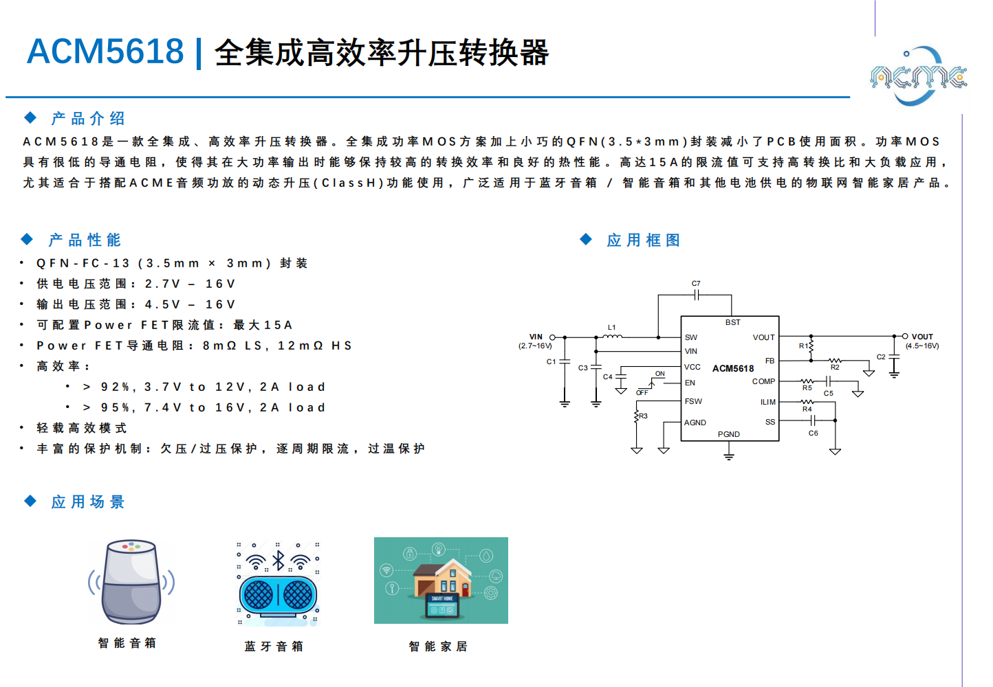 A C M 5 6 1 8是一款全集成、高效率升压转换器。全集成功率M O S方案加上小巧的Q F N(3.5*3 m m)封装减小了P C B使用面积。功率M O S具有很低的导通电阻,使得其在大功率输出时能够保持较高的转换效率和良好的热性能。高达15A的限流值可支持高转换比和大负载应用,其适合于搭配A C M E音频功放的动态升压(C l a s s H)功能使用,广泛适用于蓝牙音箱/智能音箱和其他电池供电的物联网智能家居产品。