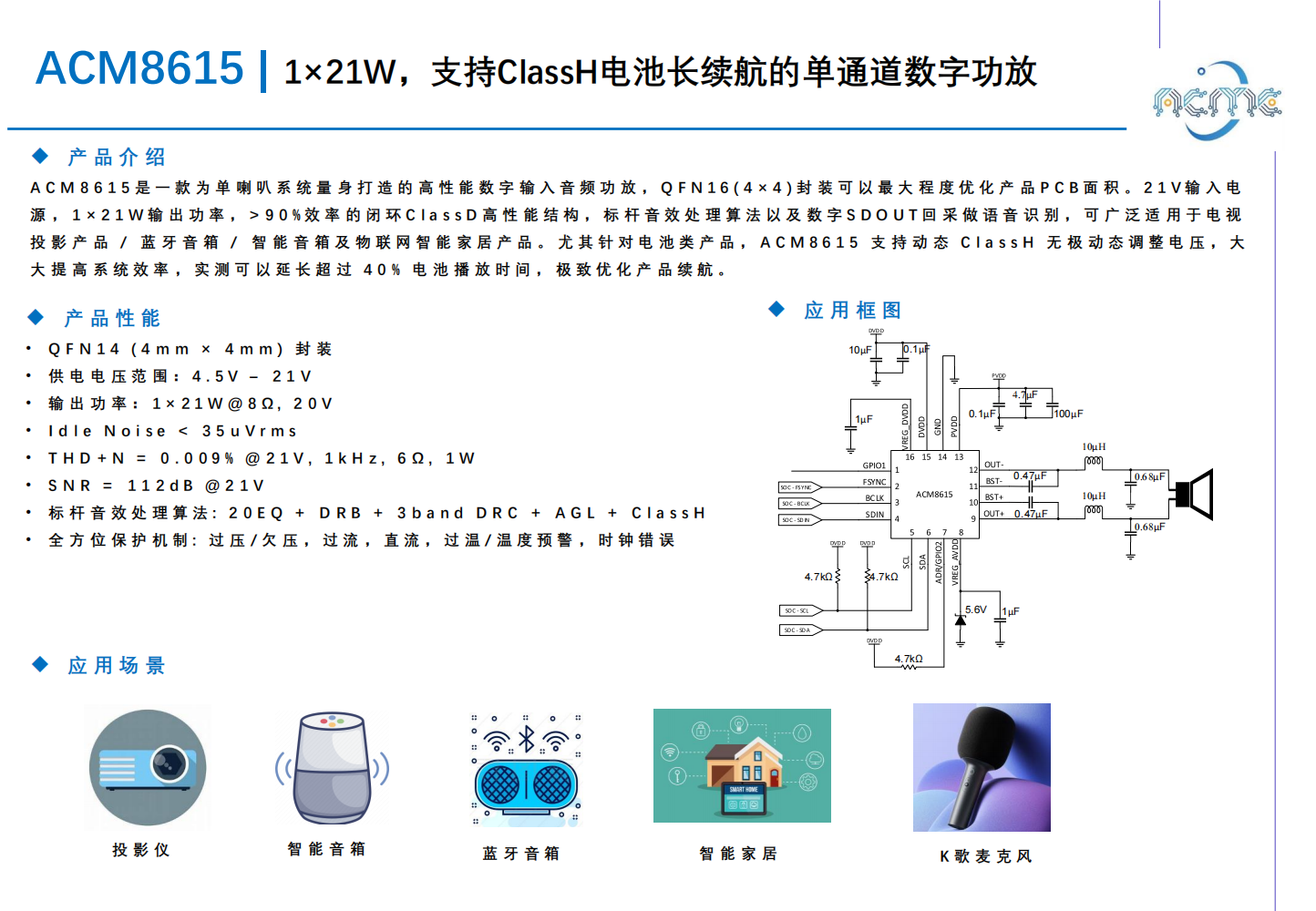 ACM8615是一款为单喇叭系统量身打造的高性能数字输入音频功放,QFN16(4×4)封装可以最大程度优化产品PCB面积