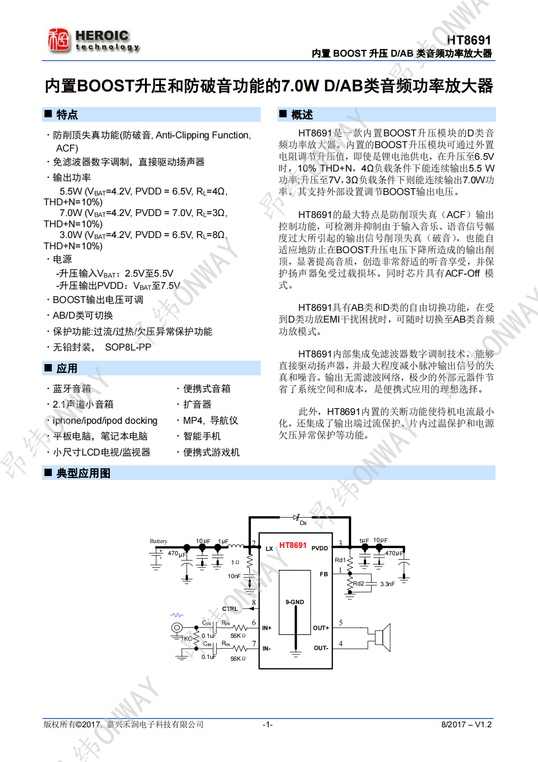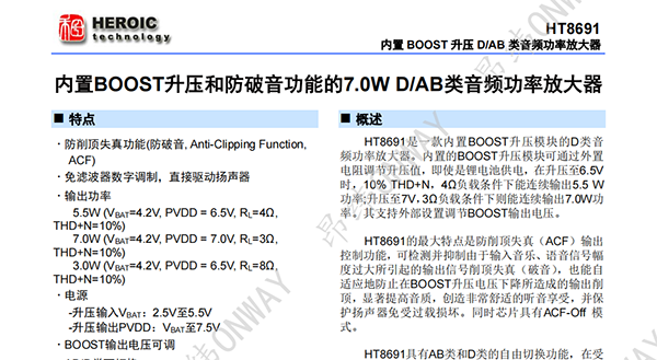 HT8691是一款内置BOOST升压模块的D类音频功率放大器。内置的BOOST升压模块可通过外置电阻调节升压值,即使是锂电池供电,在升压至6.5V时,10%THD+N,4Ω负载条件下能连续输出5.5 W功率;升压至7V,3Ω负载条件下则能连续输出7.0W功率。其支持外部设置调节BOOST输出电压。HT8691的最大特点是防削顶失真(ACF)输出控制功能,可检测并抑制由于输入音乐、语音信号幅度过大所引起的输出信号削顶失真(破音),也能自适应地防止在BOOST升压电压下降所造成的输出削顶,显著提高音质,创造非常舒适的听音享受,并保护扬声器免受过载损坏。同时芯片具有ACF-Off模式。