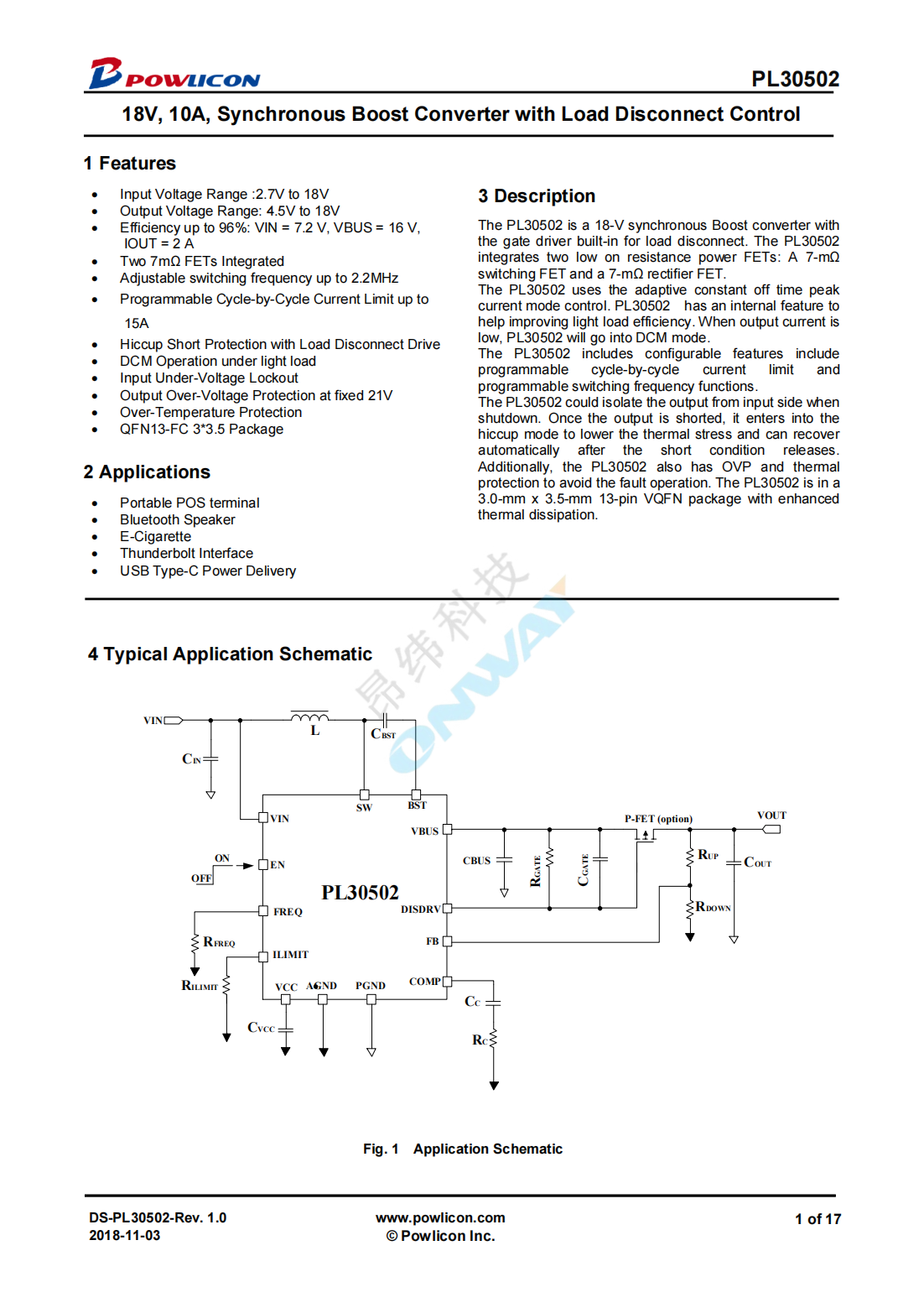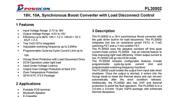 The PL30502 is a 18-V synchronous Boost converter with the gate driver built-in for load disconnect. The PL30502 integrates two low on resistance power FETs: A 7-mΩ switching FET and a 7-mΩ rectifier FET