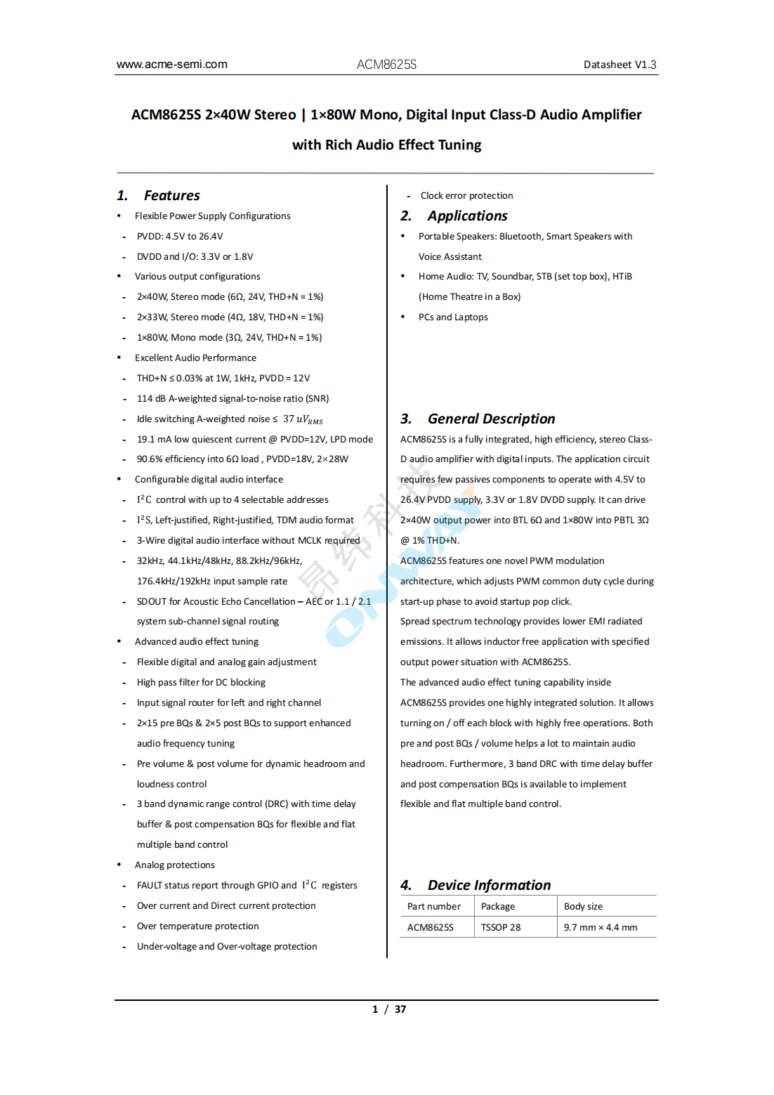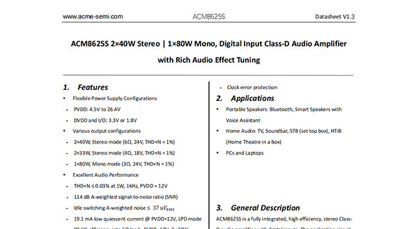 ACM8625Sis a fully integrated, high efficiency, stereo Class-D audio amplifier with digital inputs