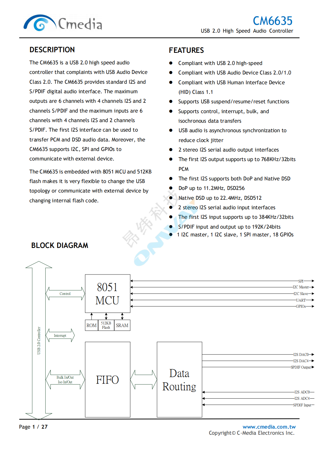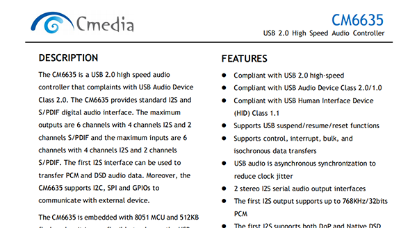 The CM6635 is a USB 2.0 highspeed audio controllerthat complaintswithUSB Audio Device Class 2.0.The CM6635provides standard I2S and S/PDIF digital audio interface