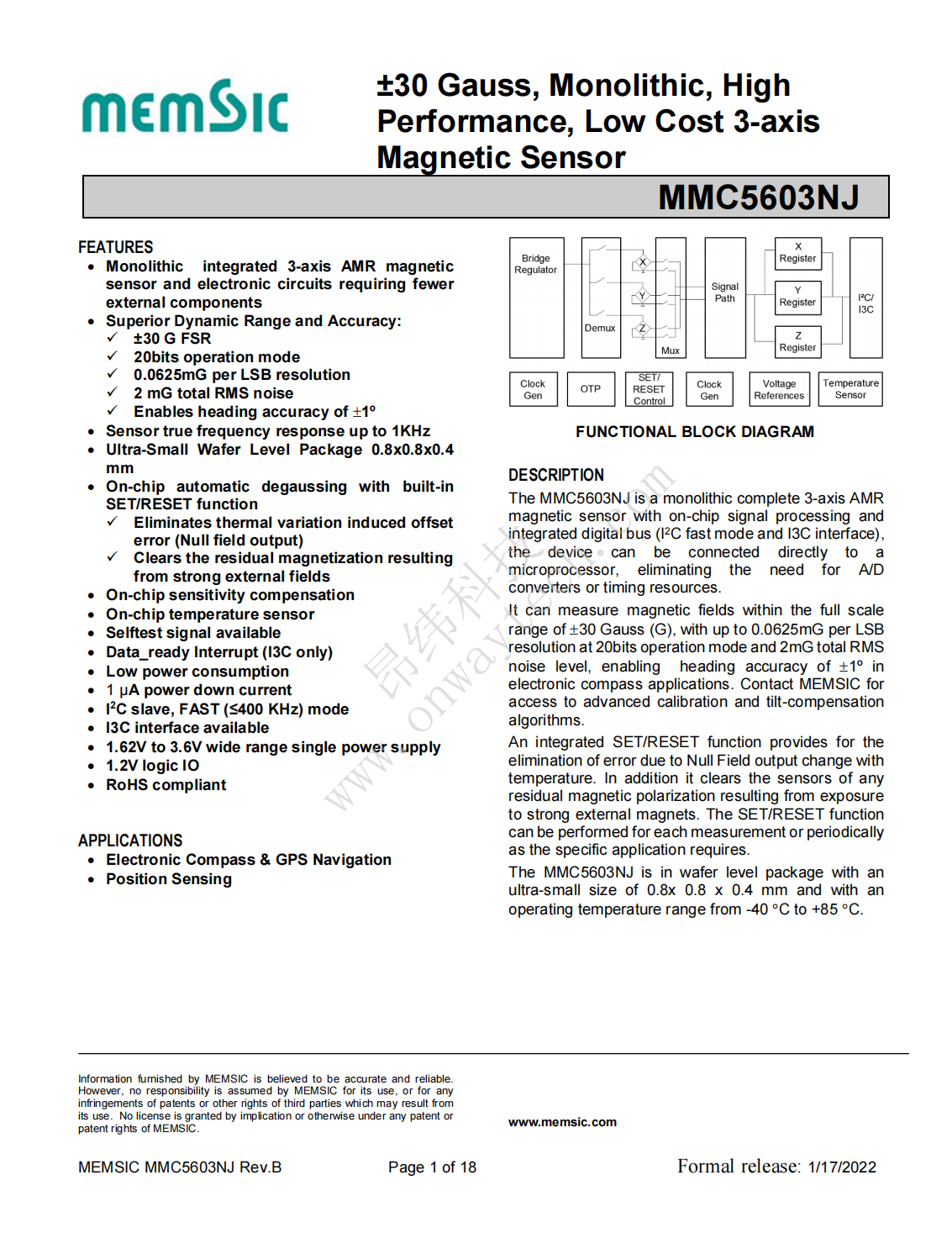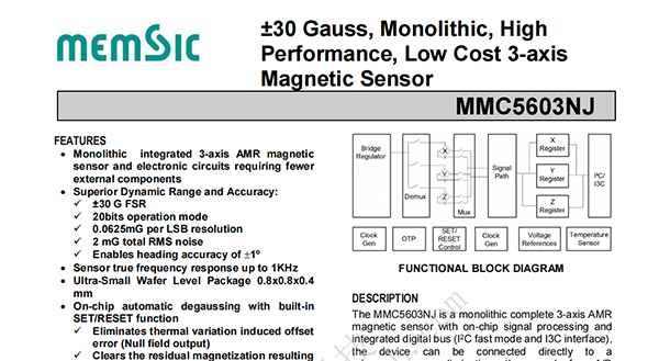 晶圆级封装,0.8x0.8x0.4mm,I²C接口,±30g量程,高性能AMR三轴磁传感器