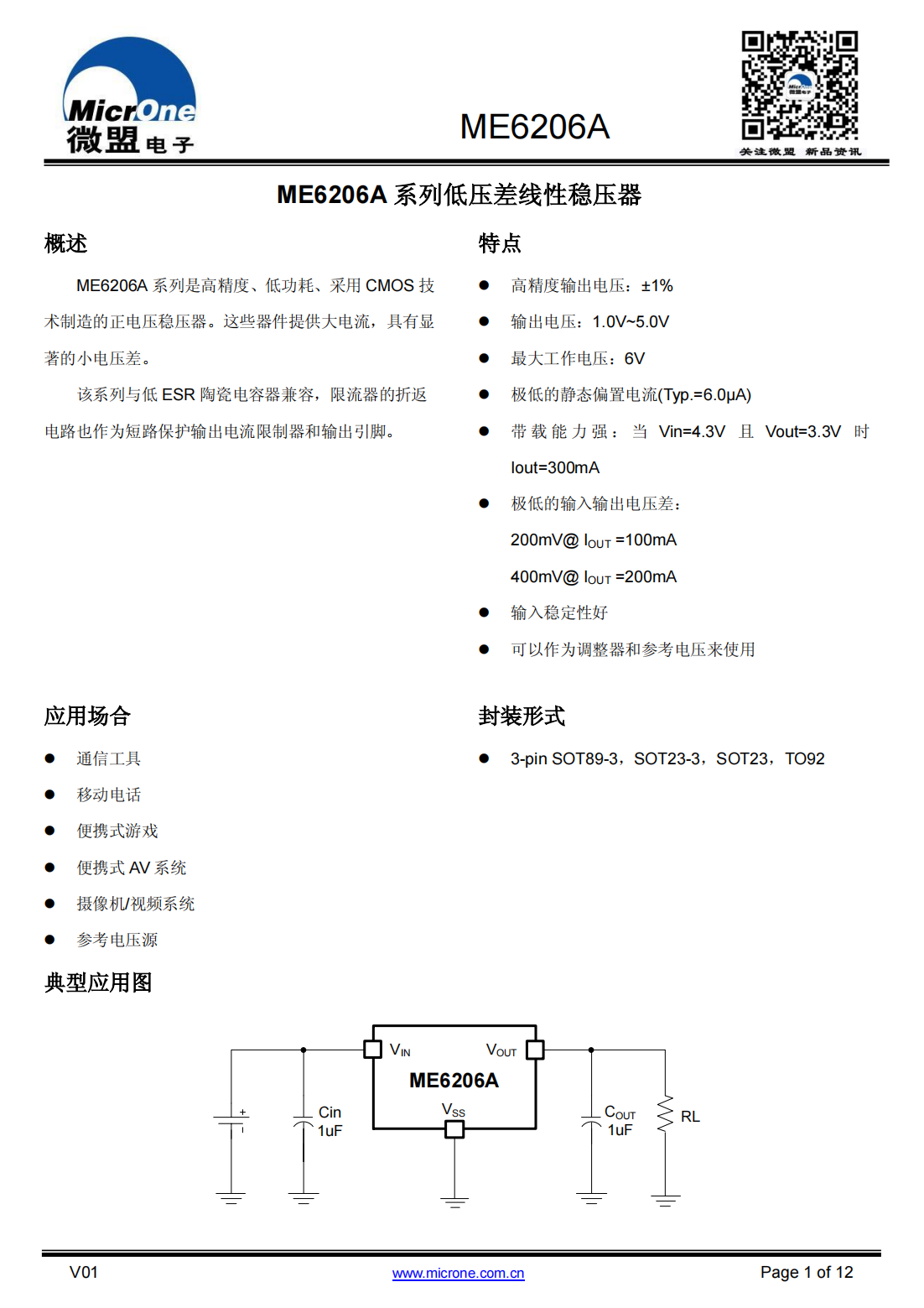 ME6206A 系列是高精度、低功耗、采用 CMOS 技 术制造的正电压稳压器。这些器件提供大电流,具有显 著的小电压差