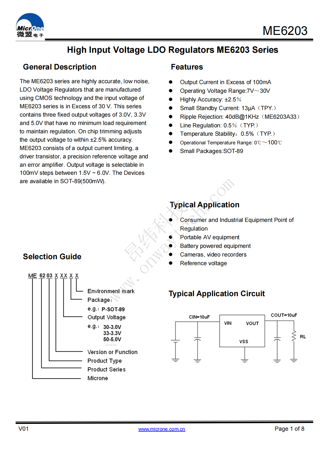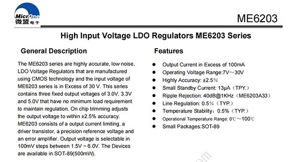 The ME6203 series are highly accurate, low noise, LDO Voltage Regulators that are manufactured using CMOS technology and the input voltage of ME6203 series is in Excess of 30 V