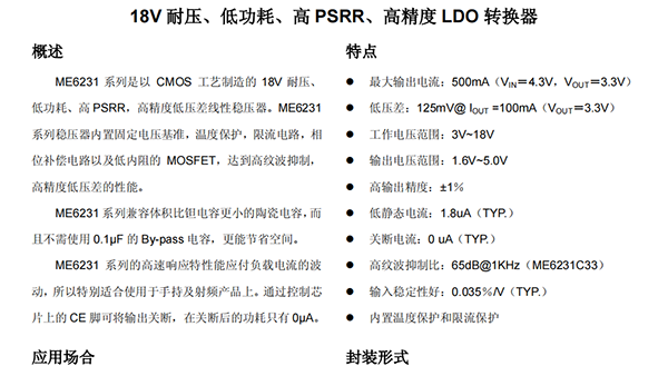 ME6231 系列是以 CMOS 工艺制造的 18V 耐压、 低功耗、高 PSRR,高精度低压差线性稳压器。ME6231 系列稳压器内置固定电压基准,温度保护,限流电路,相 位补偿电路以及低内阻的 MOSFET,达到高纹波抑制, 高精度低压差的性能