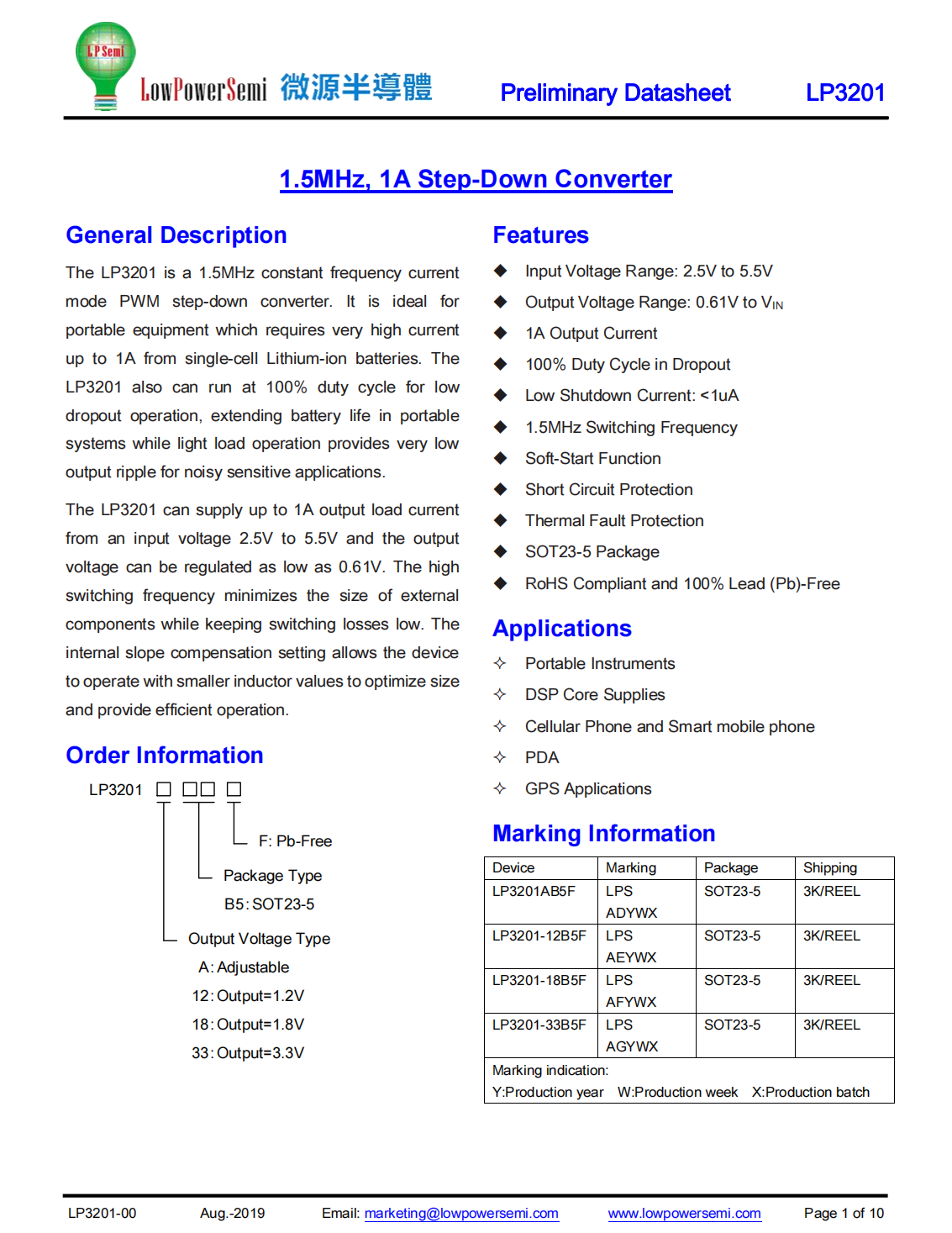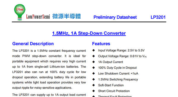 The LP3201 is a 1.5MHz constant frequency current mode PWM step-down converter. It is ideal for portable equipment which requires very high current up to 1A from single-cell Lithium-ion batteries