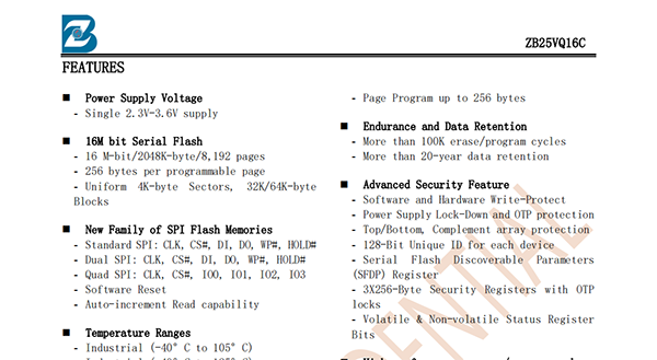 The ZB25VQ16C of non-volatile flash memory device supports the standard Serial Peripheral Interface (SPI)