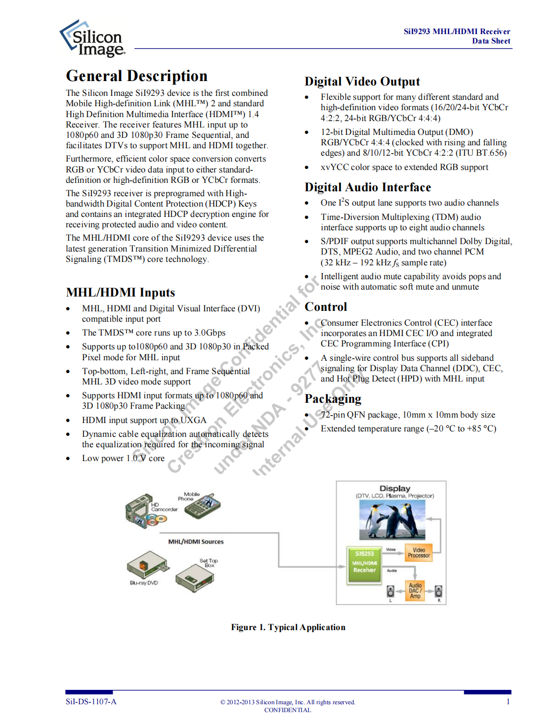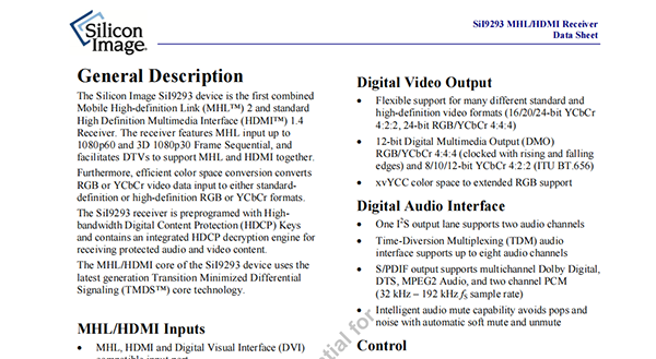 The Silicon Image SiI9293 device is the first combined Mobile High-definition Link (MHL™) 2 and standard High Definition Multimedia Interface (HDMI™) 1.4 Receiver