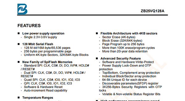 The ZB25VQ128A of non-volatile flash memory device supports the standard Serial Peripheral Interface (SPI)