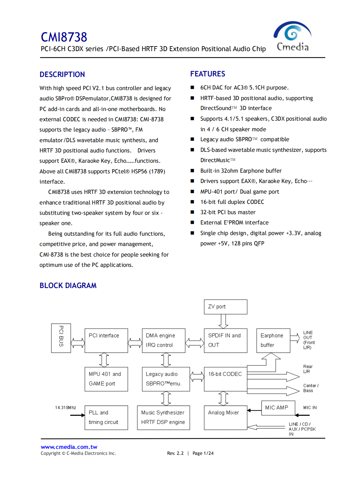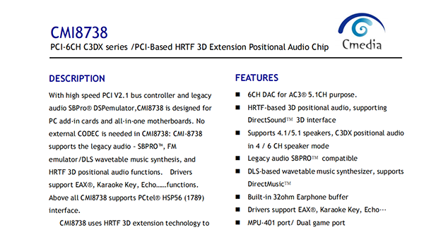 With high speed PCI V2.1 bus controller and legacy audio SBPro® DSPemulator,CMI8738 is designed for PC add-in cards and all-in-one motherboards