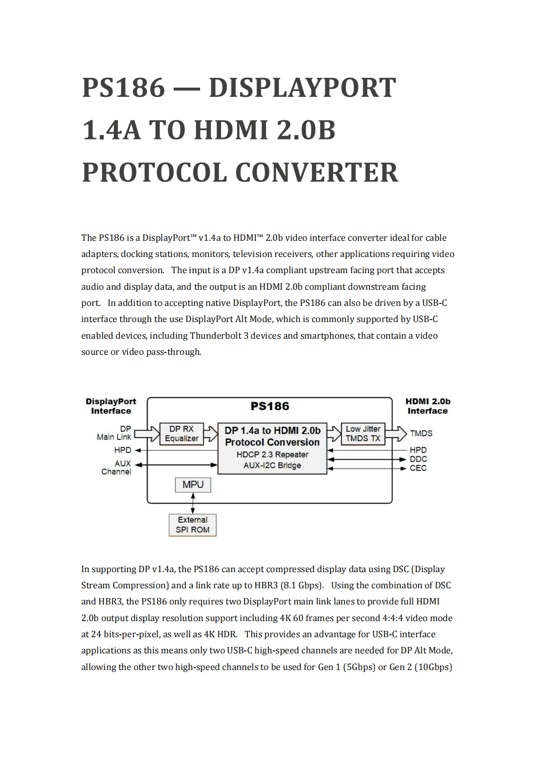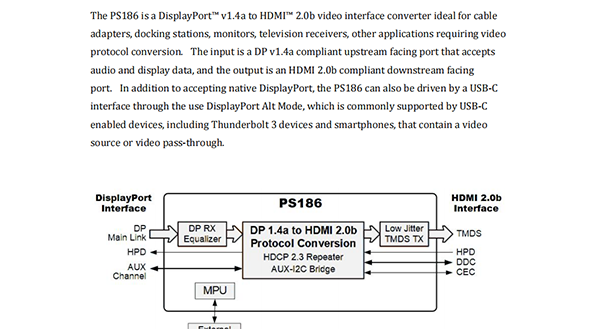 The PS186 is a DisplayPort™ v1.4a to HDMI™ 2.0b video interface converter ideal for cable adapters, docking stations, monitors, television receivers, other applications requiring video protocol conversion