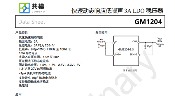 GM1204是一款低压差稳压器,专为快速瞬态响应而优化。该装置能够提供3A的输出电流,典型压降为255mV。工作静态电流为1mA,关机时降至1μA以下。压差模式下静态电流控制良好;与许多其他稳压器一样,静态电流在压差模式下并没有上升。除了快速瞬态响应外,GM1204还具有非常低的输出电压噪声,这使得该器件非常适合敏感的射频电源应用。输出电压范围为1.21V至20V。GM1204稳压器稳定,输出电容低至10μF。内部保护电路包括电流限制和热限制。该器件有1.5V、1.8V、2.5V、3.3V、5V的固定输出电压,以及1.21V参考电压的可调输出电压。GM1204稳压器是5引脚TO-263封装和TSSOP-16封装。