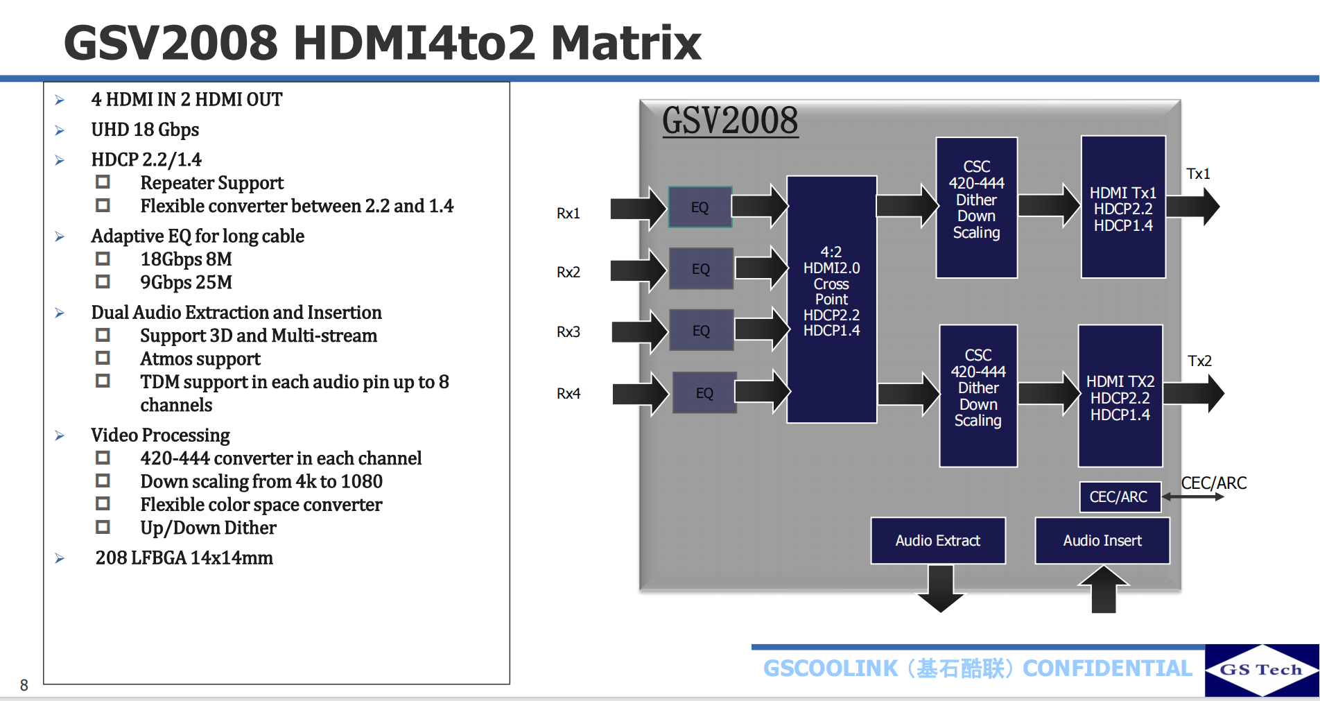 GSV2008是HDMI2.0/HDCP2.2 4x2矩阵,支持DownScaler,CSC及音频分离和音频嵌入,支持ARC及CEC功能。