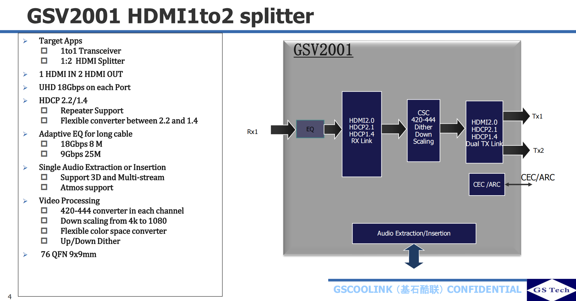 GSV2001高性价比HDMI2.0/HDCP2.2 1to2 Splitter,支持DownScaler,CSC及音频分离和音频嵌入,支持ARC及CEC功能。可以替代ITE CH6001/IT6663 EP9162S LT86012
