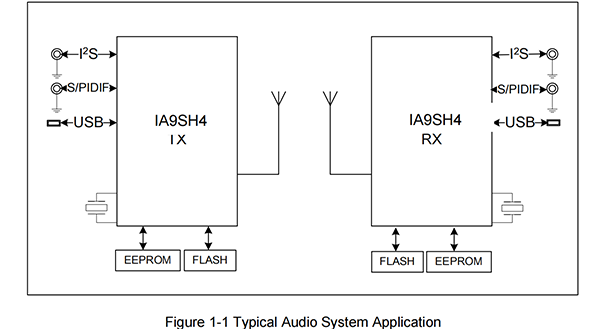 IA9SH4 provides dual transmitter and receiver modes,which enables the seamless and bi-directional transmission of high quality audio.In the transmitter,Tx receives digitized stereo as input,which is packetized and processed for synchronization and data integrity.After that,the data are modulated and radiated at 2.4~2.485 GHz ISM band.In the receiver,Rx receives RF signal,demodulated and processed to restore the transmitted signal,and then streamed as digital audio output.Figure 1-1 illustrates a