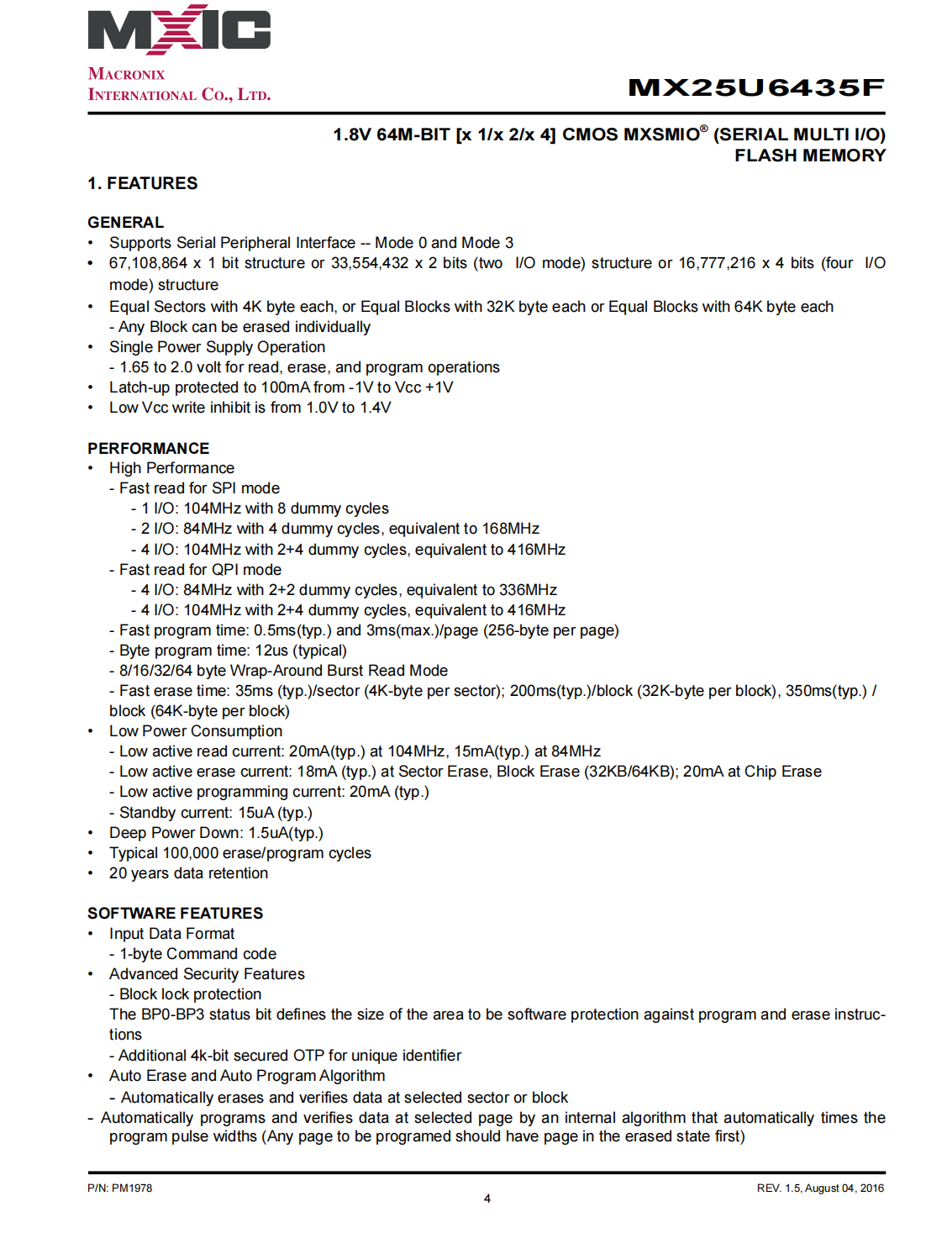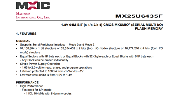 -Fast erase time:35ms(typ.)/sector(4K-byte per sector);200ms(typ.)/block(32K-byte per block),350ms(typ.)/block(64K-byte per block)