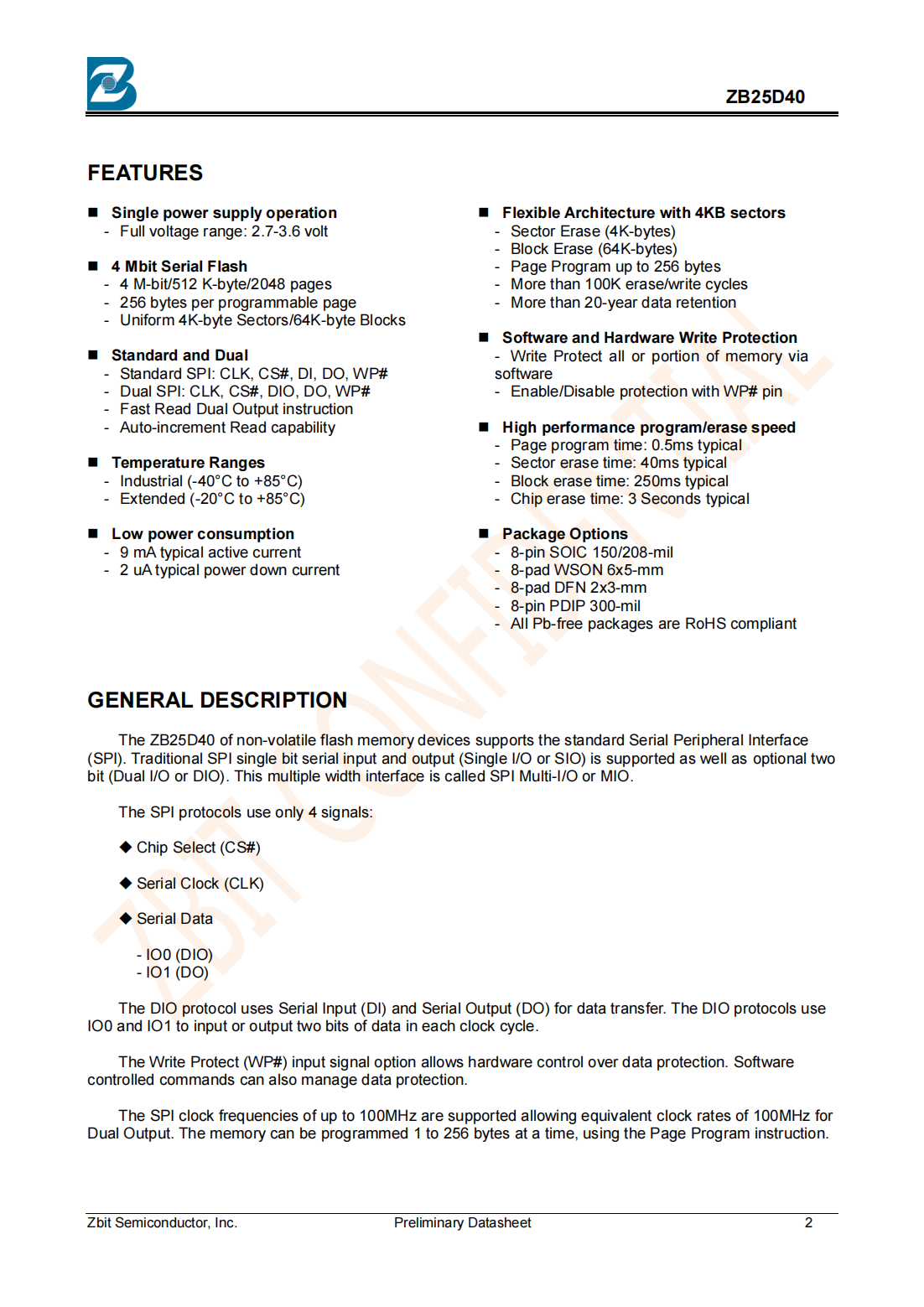 The ZB25D40 is designed to allow either single Sector/Block at a time or full chip erase operation.The ZB25D40 can be configured to protect part of the memory as the software protected mode.The device can sustain a minimum of 100K program/erase cycles on each sector or block.