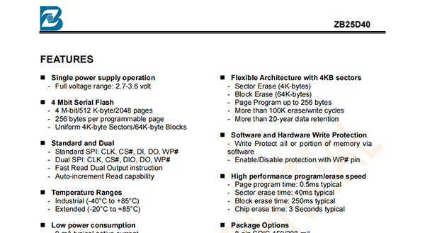 The ZB25D40 provides an ideal storage solution for systems with limited space,signal connections,and power.These memories'flexibility and performance is better than ordinary serial flash devices.They are ideal for code shadowing to RAM,executing code directly(XIP),and storing reprogrammable data.