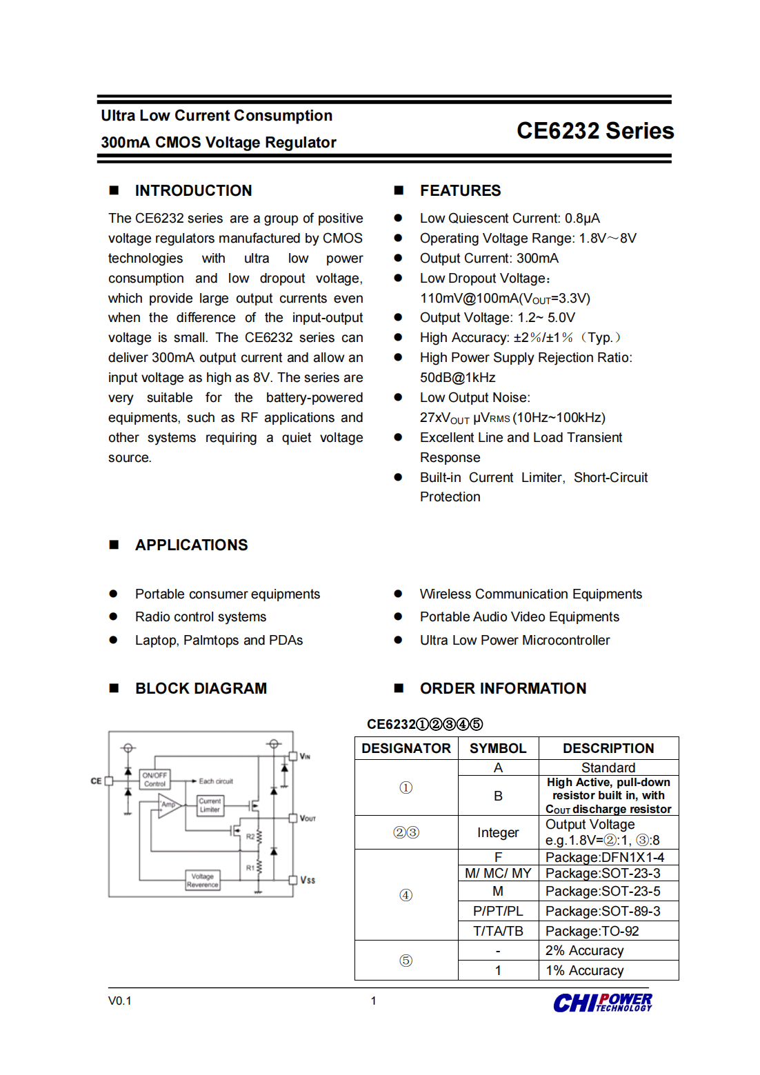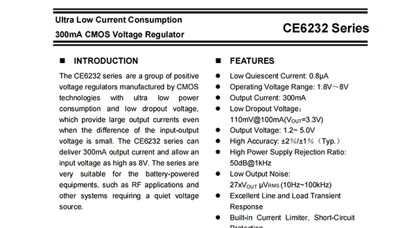 The CE6232 series are a group of positive voltage regulators manufactured by CMOS technologies with ultra low power consumption and low dropout voltage,which provide large output currents even when the difference of the input-output voltage is small.The CE6232 series can deliver 300mA output current and allow an input voltage as high as 8V.The series are very suitable for the battery-powered equipments,such as RF applications and other systems requiring a quiet voltage source.