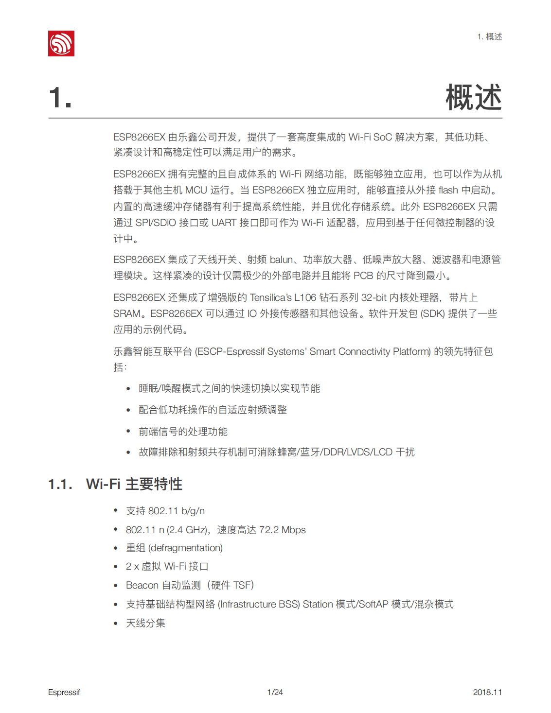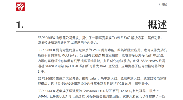 ESP8266EX由乐鑫公司开发,提供了⼀套⾼度集成的Wi-Fi SoC解决⽅案,其低功耗、紧凑设计和⾼稳定性可以满⾜⽤户的需求。