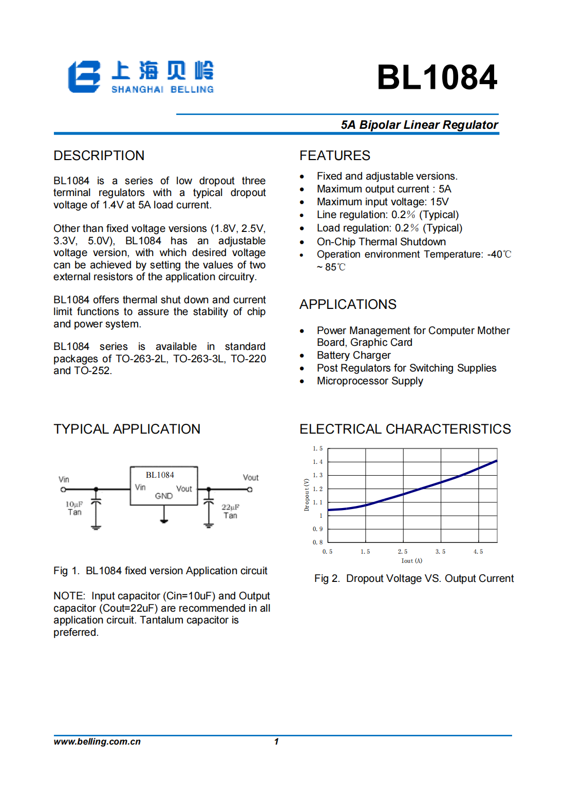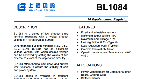 BL1084 is a series of low dropout three terminal regulators with a typical dropout voltage of 1.4V at 5A load current.Other than fixed voltage versions(1.8V,2.5V,