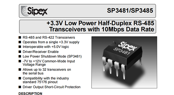 The SP3481 and the SP3485 are a family of+3.3V low power half-duplex transceivers that meet the specifications of the RS-485 and RS-422 serial protocols.These devices are pin-topin compatible with the Sipex SP481,SP483,and SP485 devices as well as popular industry standards.The SP3481 and the SP3485 feature Sipex's BiCMOS process,allowing low power operation without sacrificing performance.The SP3481 and SP3485 meet the electrical specifications of RS-485 and RS-422 serial protocols up to 10Mbps under load.The SP3481 is equipped with a low power Shutdown mode.