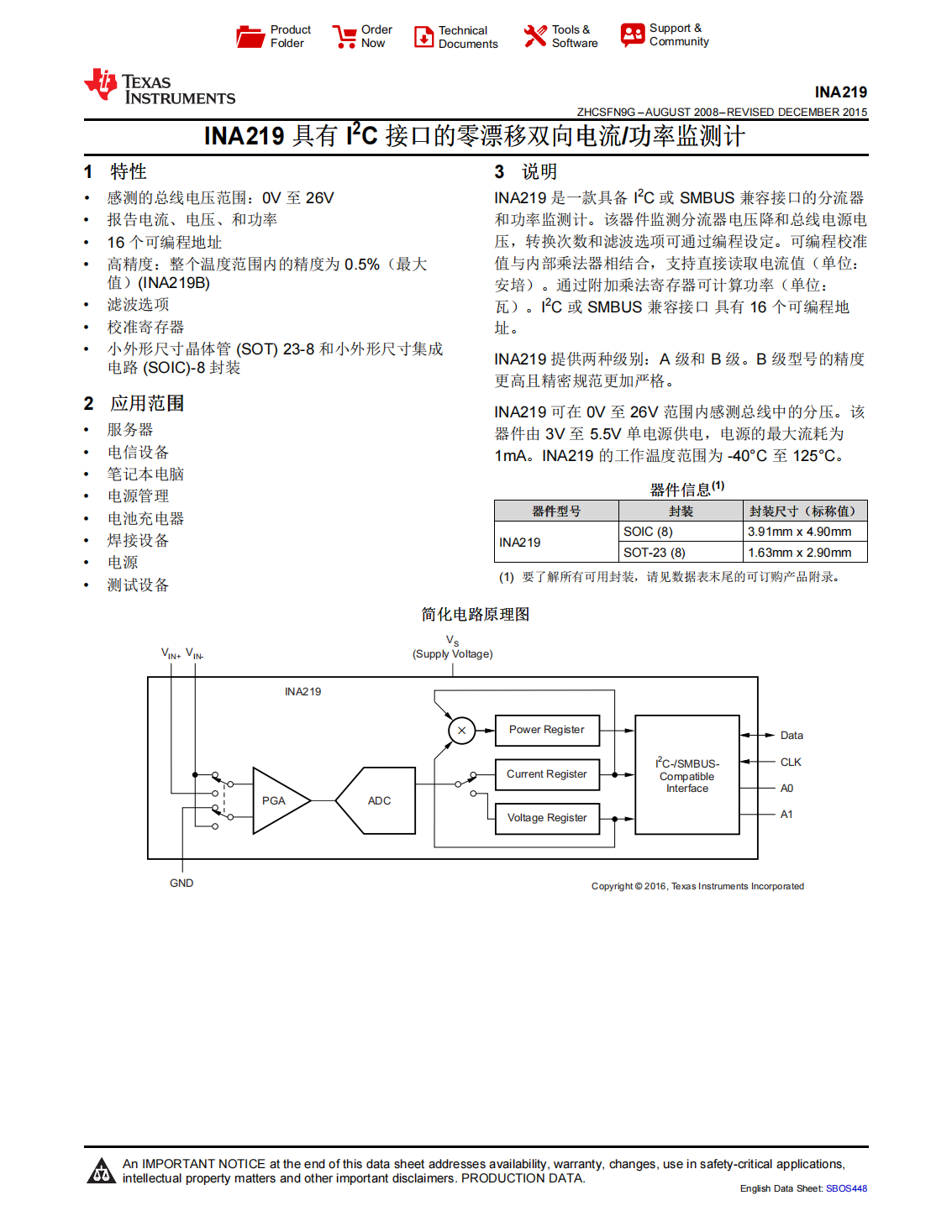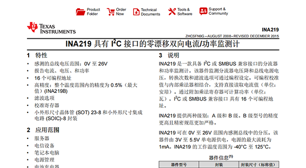 •高精度:整个温度范围内的精度为0.5%(最大值)(INA219B)