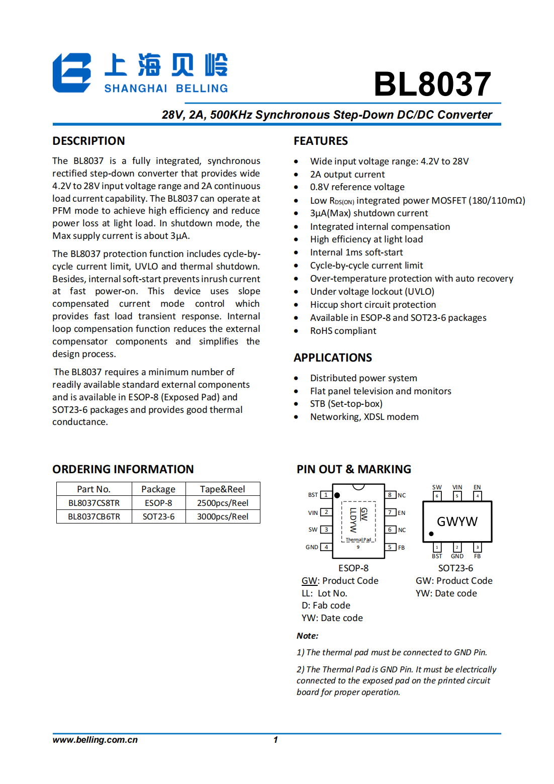 The BL8037 requires a minimum number of readily available standard external components and is available in ESOP-8(Exposed Pad)and SOT23-6 packages and provides good thermal conductance.