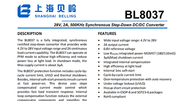 The BL8037 is a fully integrated,synchronous rectified step-down converter that provides wide 4.2V to 28V input voltage range and 2A continuous load current capability.The BL8037 can operate at PFM mode to achieve high efficiency and reduce power loss at light load.In shutdown mode,the Max supply current is about 3μA.