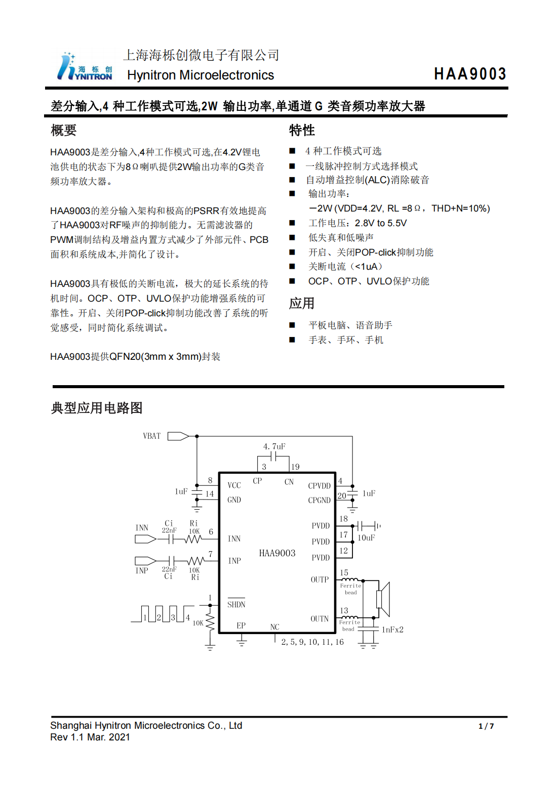 HAA9003具有极低的关断电流,极大的延长系统的待机时间。OCP、OTP、UVLO保护功能增强系统的可靠性。开启、关闭POP-click抑制功能改善了系统的听觉感受,同时简化系统调试。