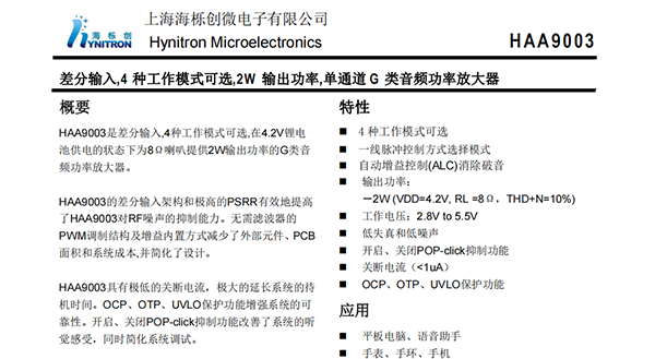 HAA9003是差分输入,4种工作模式可选,在4.2V锂电池供电的状态下为8Ω喇叭提供2W输出功率的G类音频功率放大器。