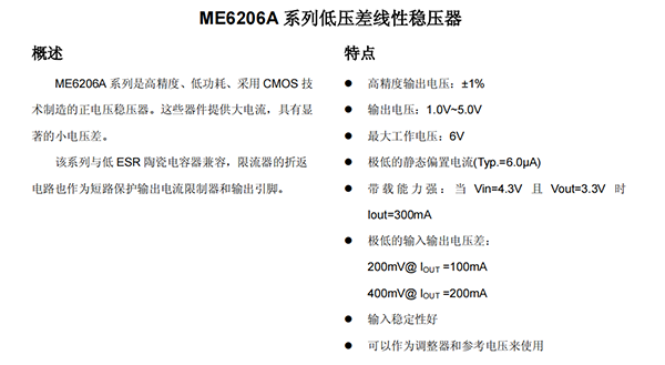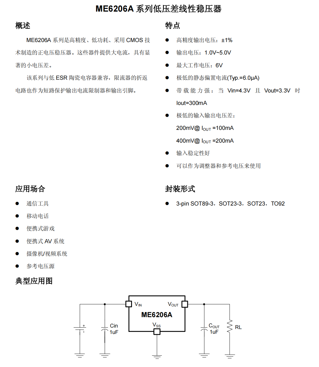 ME6206A系列是高精度、低功耗、采用CMOS技术制造的正电压稳压器。这些器件提供大电流,具有显著的小电压差。该系列与低ESR陶瓷电容器兼容,限流器的折返电路也作为短路保护输出电流限制器和输出引脚。